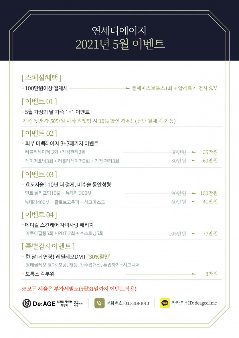 EVENT 5월 가정의 달 특별 이벤트 페이지 정보 작성자 연세디에이지 댓글 0건 조회 11,140회 작성일 21-05-21 14:34 목록 답변 본문 [EVENT] 가정의 달 특별 이벤트안녕하세요 연세디에이지클리닉 입니다. 5월 가정의 달을 맞이하여 특별하고 다양한 이벤트를 준비하였습니다:)많은 관심 부탁드립니다! 이전글특별 감사 EVENT! 21.05.18 다음글알레르기 원인 물질 파악을 위한 피부 단자 검사 21.05.18